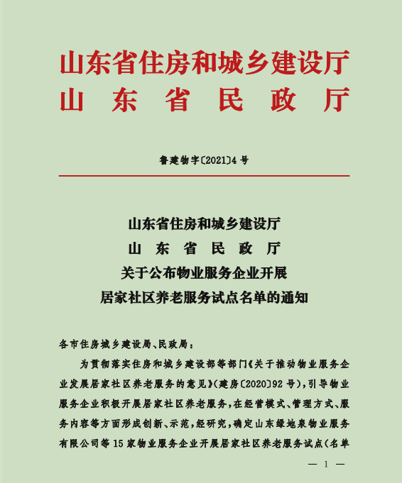 2021年9月6日,山東省住房和城鄉(xiāng)建設(shè)廳、山東省民政廳聯(lián)合公布了關(guān)于物業(yè)服務(wù)企業(yè)開展居家社區(qū)養(yǎng)老服務(wù)試點(diǎn)名單,我公司在首批試點(diǎn)名單之列。 ......