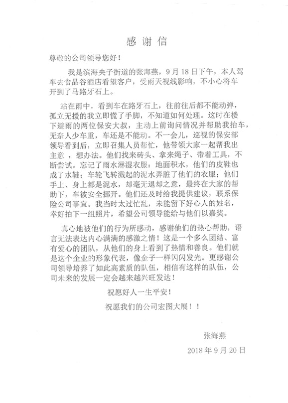 他們沒(méi)雪中送炭,他們沒(méi)錦上添花,他們只是做了應(yīng)該做的,又或許他們更懂得思考換位,他們是昌大公管下轄中國(guó)·濰坊食品谷的物業(yè)人。雖然小編時(shí)至一個(gè)月才拿到感謝信,還是想將這份溫情傳遞給每一位平凡崗位上的我們。 ......