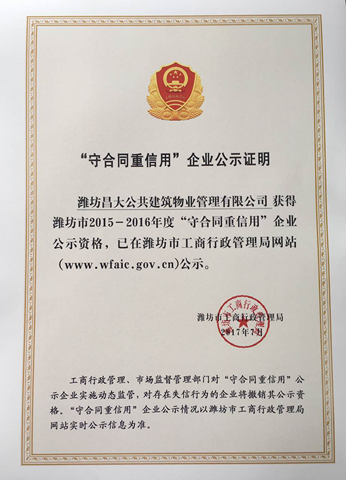 近日,濰坊市工商行政管理局公布了“濰坊市2015--2016年度“守合同重信用”企業(yè)公示名單。濰坊昌大公共建筑物業(yè)管理有限公司獲此殊榮。榮獲“守合同重信用”企業(yè)稱號(hào),是我市政府部門及社會(huì)各界對(duì)“昌大公管公司”長期以來堅(jiān)持誠信經(jīng)營、嚴(yán)守合同的充分肯定,也體現(xiàn)了“昌大公管公司”良好的企業(yè)信譽(yù)。 ......
